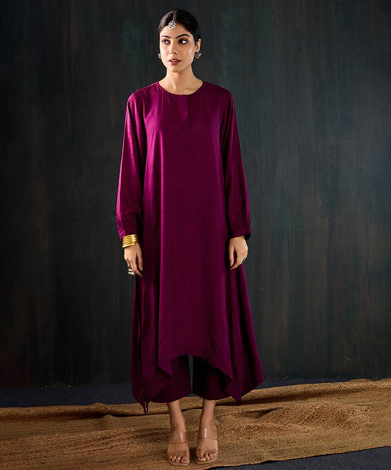 Kurta: Purple Three Kali Kurta In The Anar Silhouette. Crafted In Luxurious Dola Silk Fabric, It Features A Flowy, Anti Fit Design That Drapes Beautifully On The Body. Pant: Matching Straight Pants In Purple, Tailored For A Clean And Elegant Finish.