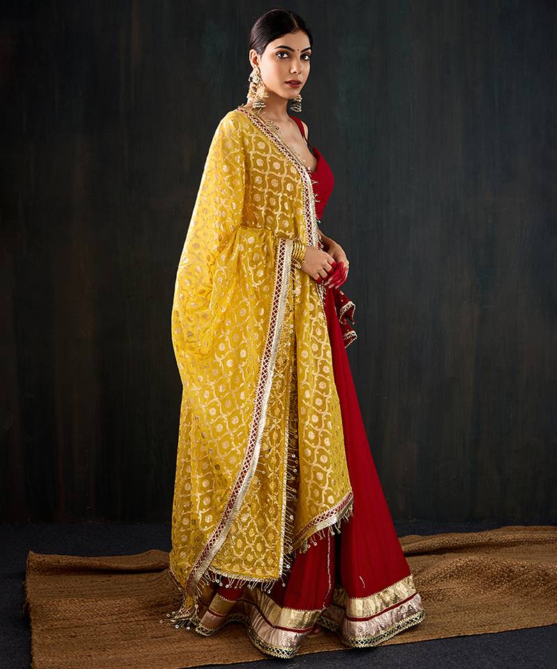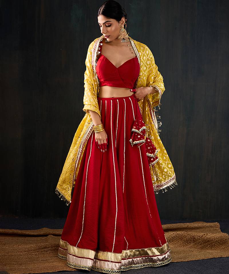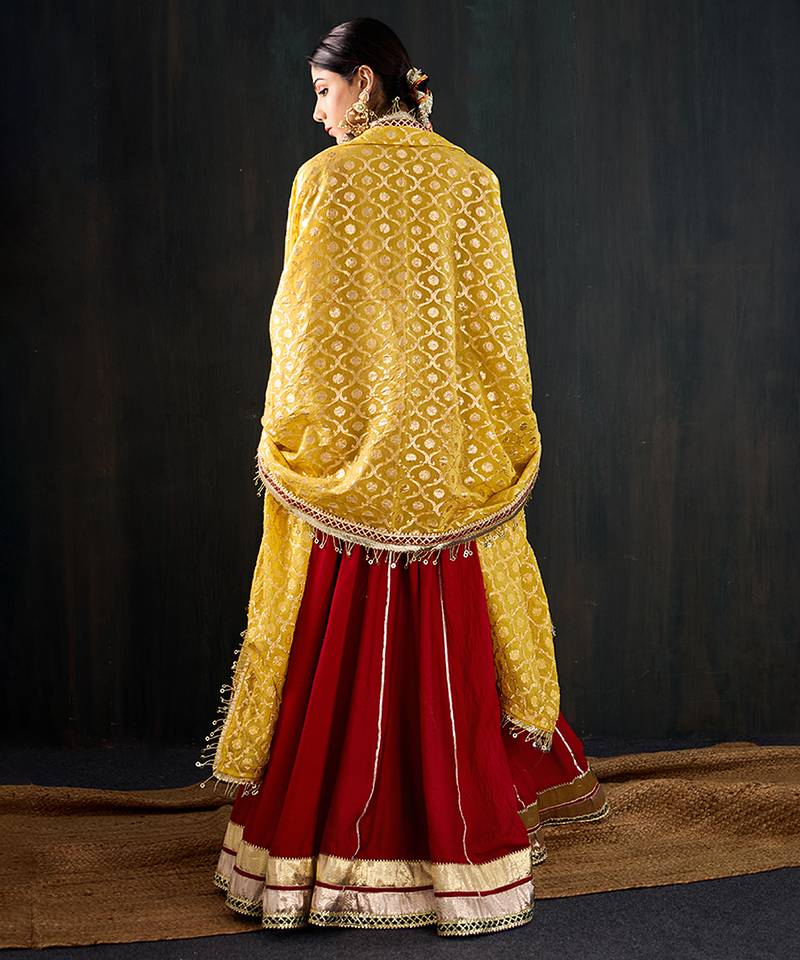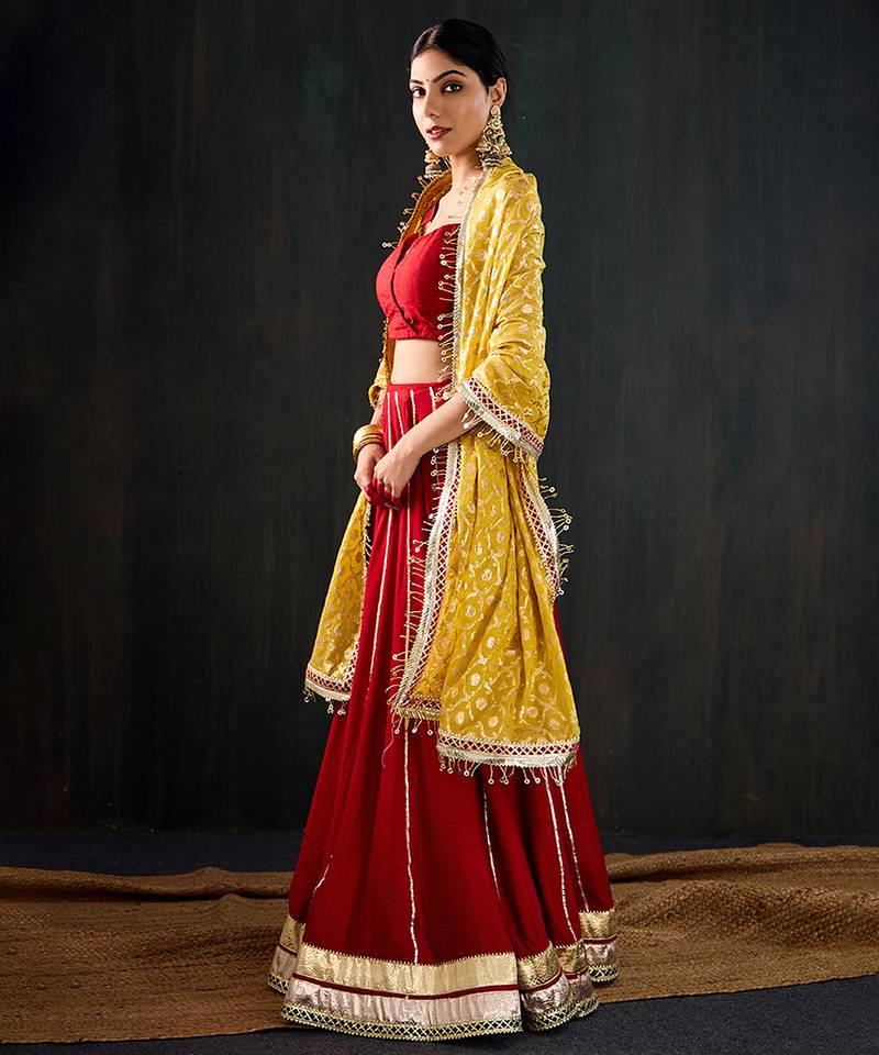 Product Description | Lehenga: Red Lehenga Adorned With Gota Work All Over And Pretty Latkans On The Sides.Blouse: Red Sleeveless Blouse.Dupatta: Statement Contrast Yellow Chanderi Dupatta With Jaal Jacquard Work, Jhallar, And Red Gota Lace Detailing..Pairing & Occasion: Ideal For Weddings, Festive Celebrations, Or Special Occasions. Pair With Statement Earrings, Bangles, And Juttis For A Traditional Look, Or Heels For A Modern Festive Style.