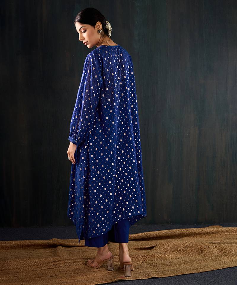 Product Description | Kurta: Royal Blue Three Kali Kurta In The Anar Silhouette. Crafted In Chanderi Fabric With Floral Jacquard All Over, It Features A Flowy, Anti Fit Design That Drapes Beautifully On The Body. Comes With A Sleeveless Inner For Added Comfort And Coverage. Pant: Matching Straight Pants In Royal Blue, Tailored For A Clean And Elegant Finish.