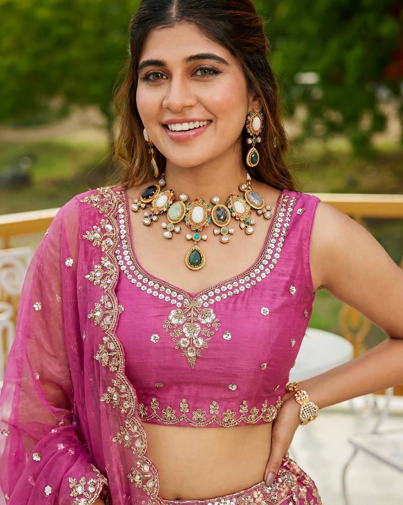 | Product Description | The Lehenga Is Crafted In A Beautiful Rose Pink Satin Shade That Looks Rich And Graceful. It Features Motifs And Crystal Handwork, Dori Embroidery, Sequin Work, And Various Detailed Embroidery That Enhance Its Royal Charm.
