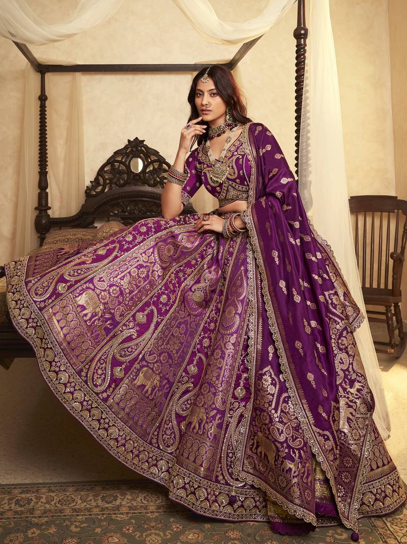 Awesome purple embroidered banarasi silk reception wear lehenga choli with dupatta