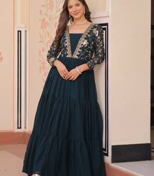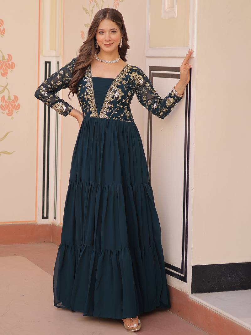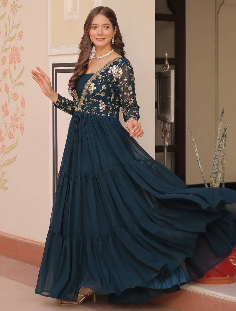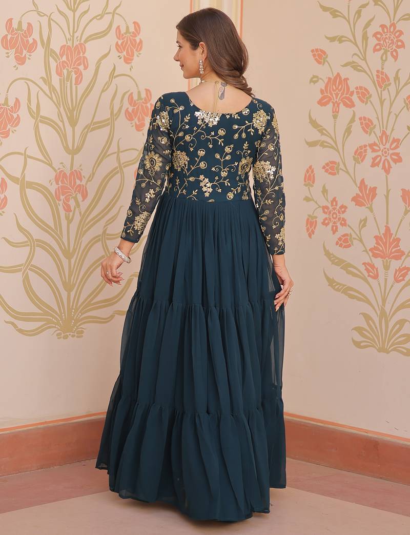 This Elegant Gown In A Rich Rama Green Shade Is Crafted From Premium Faux Blooming Fabric. The Fabric Is Beautifully Enhanced With Intricate Sequin And Zari Embroidered Work, Giving It A Luxurious Festive Look.