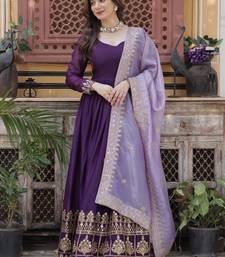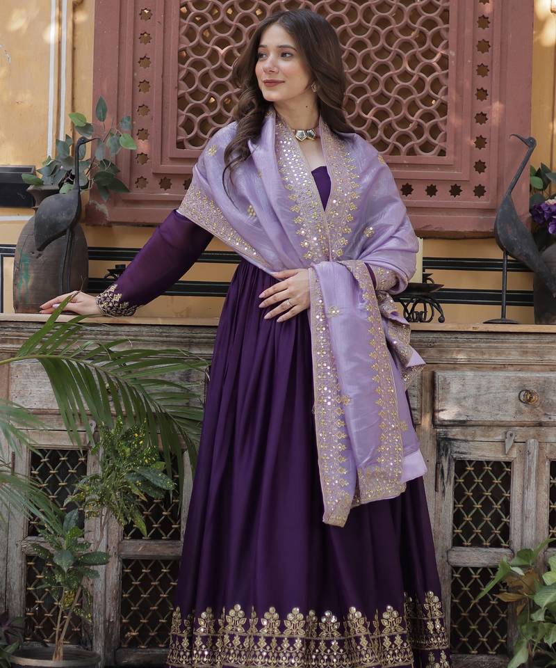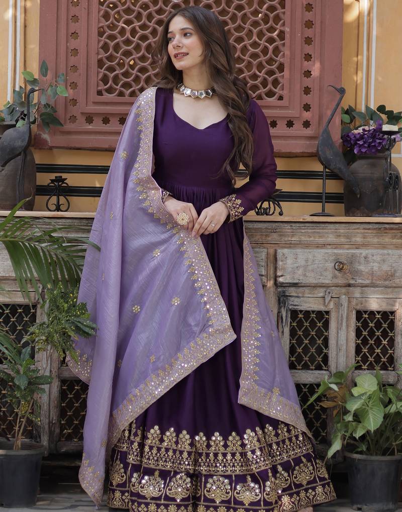 This Elegant Gown Features A Rich, Deep Purple Hue Crafted In Premium Star Georgette Fabric, Giving It A Graceful And Flowy Fall. It Is Beautifully Enhanced With Intricate Embroidery, Zari Weaving, And Subtle Sequins Work That Adds A Luxurious Festive Charm.