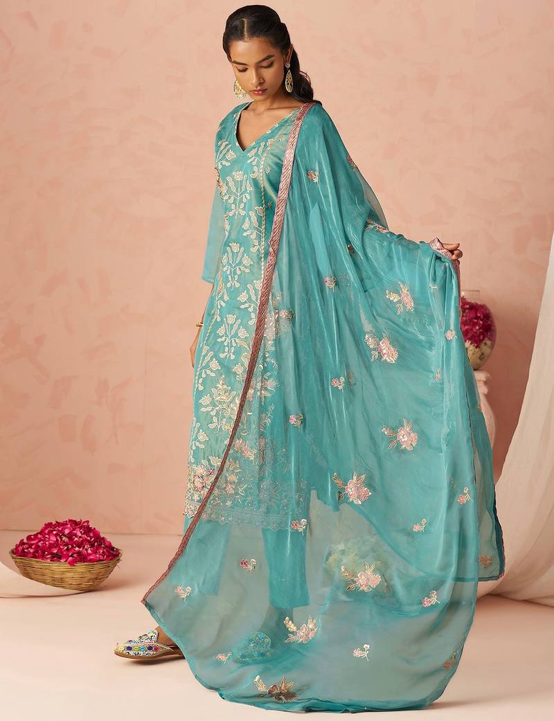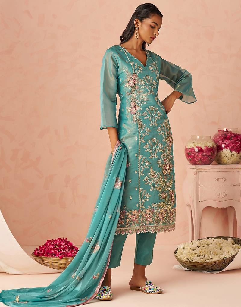 Blue Embroidered Organza Festive Wear Straight Suit