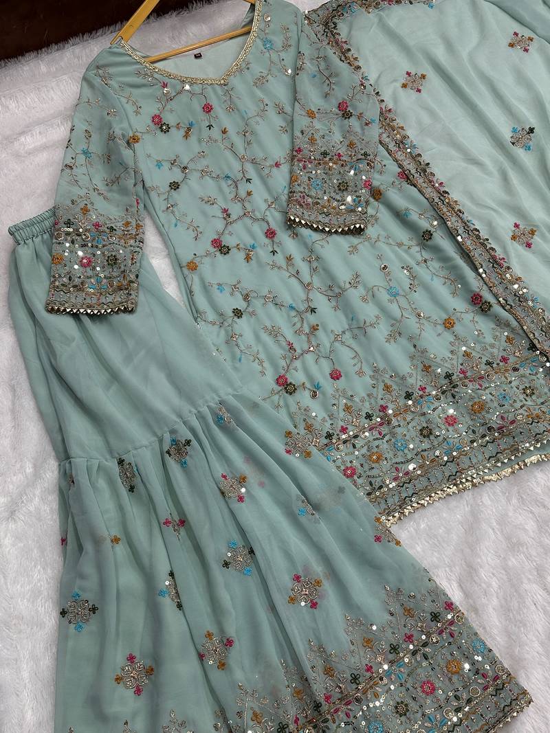 Blue embroidered georgette festive wear sharara suit stitched