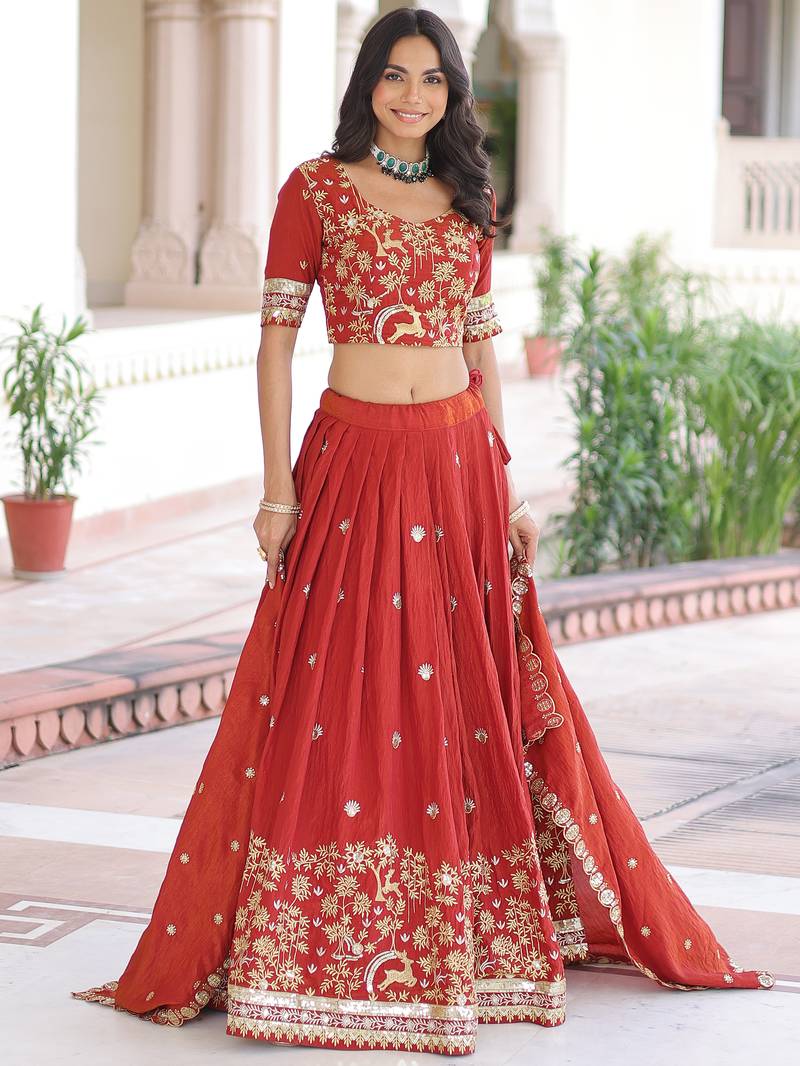 This Stunning Orange Lehenga Set Is Crafted From Premium Vichitra Silk And Highlighted With Heavy Sequins And Thread Embroidered Work, Creating A Vibrant And Festive Look.