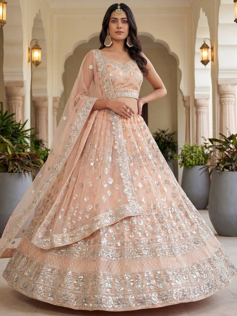 | Product Description | The Peach Net Lehenga Is Beautifully Adorned With Fine Thread Embroidery And Rich Zari Work, Giving It A Graceful And Elegant Festive Look. Stitched With Can Can And Canvas, It Features A 41 Inch Length, 3.50 Meter Flair, And Supports Waist Size Up To 42 With A Drawstring And Zip Closure. The Unstitched Blouse Comes With A Soft Micro Crepe Inner And Premium Net Fabric, Enhanced With Matching Thread Embroidery And Zari Work. With A 1.2 Meter Length, It Allows Easy Customization For A Perfect And Stylish Fit. Disclaimer: Slight Color Variation May Occur Due To Photographic Reasons. |