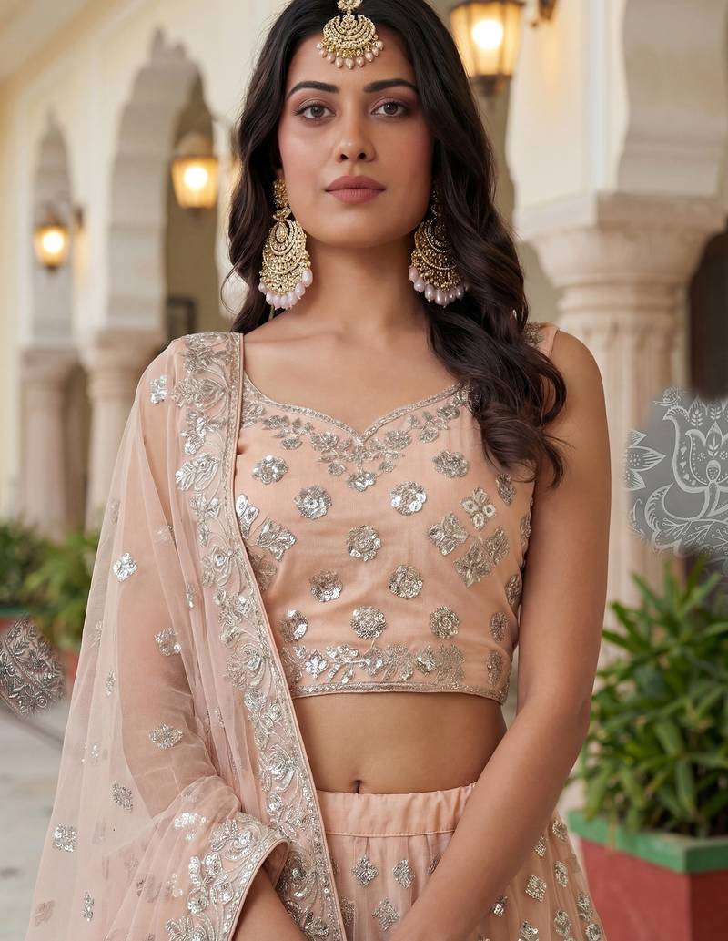 Glamorous peach zari work net engagement wear lehenga choli