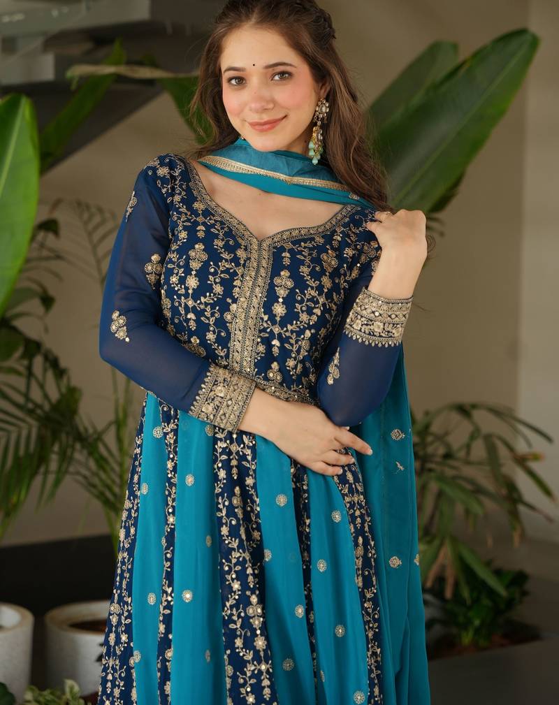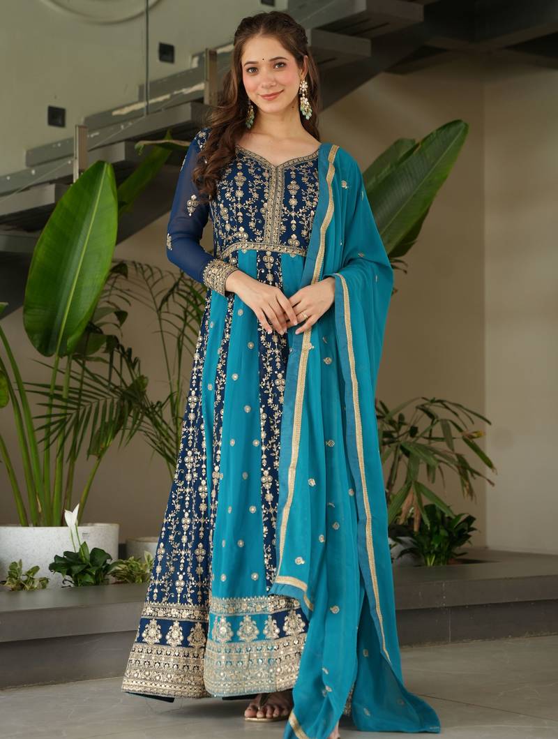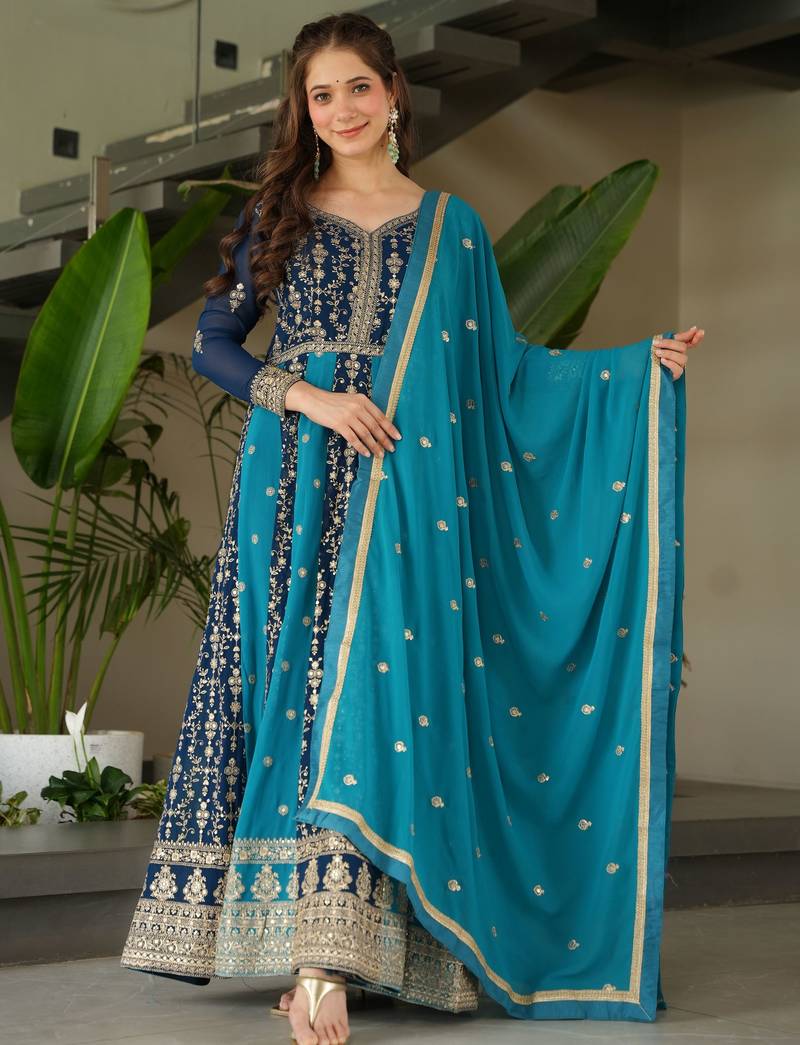 | Product Description | This Gorgeous Gown In Deep Blue Georgette Features Intricate Zari And Sequins Embroidery, Making It Perfect For Festive And Wedding Occasions.