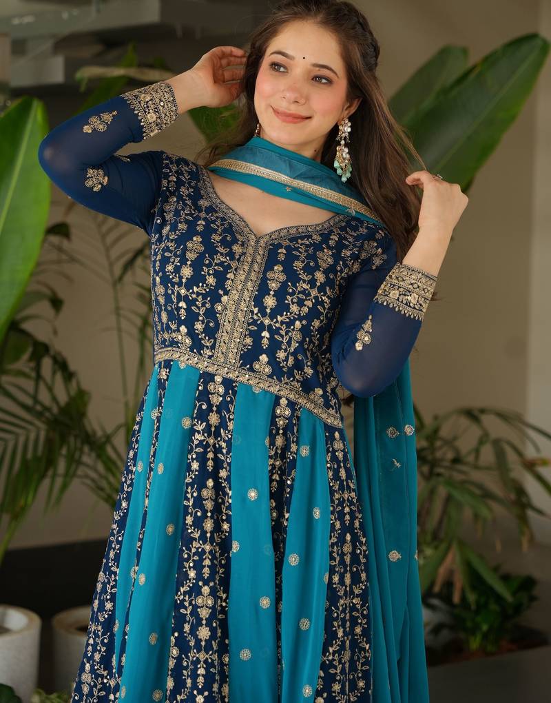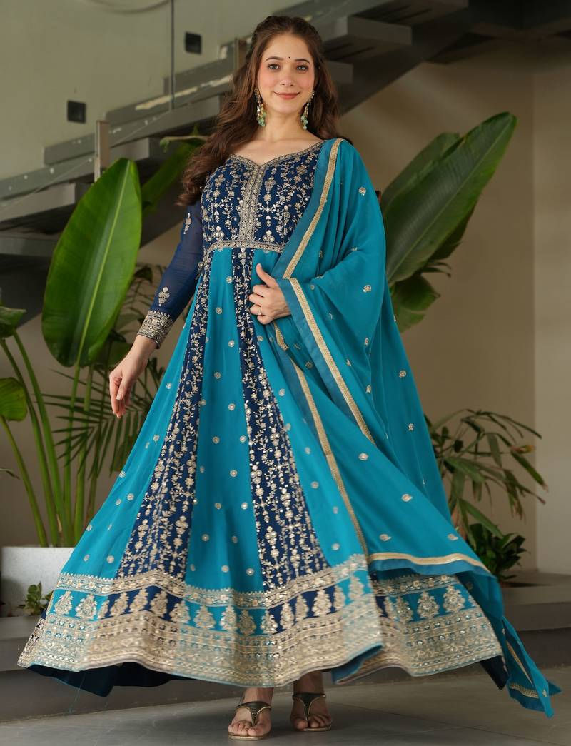 Rama blue georgette zari embroidered gown with dupatta stitched