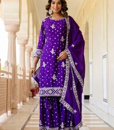 The Full Stitched Gharara Bottom Is Made From Matching Purple Chinon Silk And Enhanced With Delicate Embroidery Sequence Design Work. The Coordinated Chinon Silk Dupatta Features Fine Embroidery, Detailing And A Decorative Border, Adding Grace And Festive Charm.
