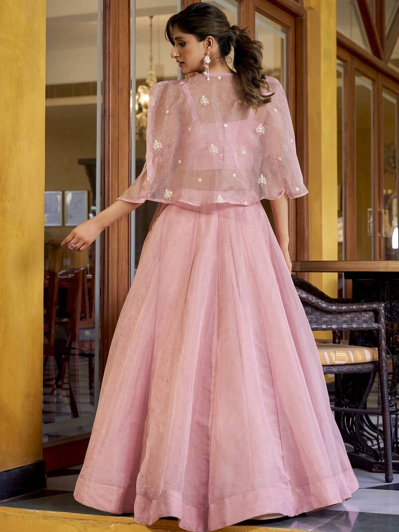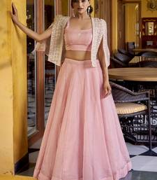 Stylish pink crushed party wear crop top lehenga with embroidered koti