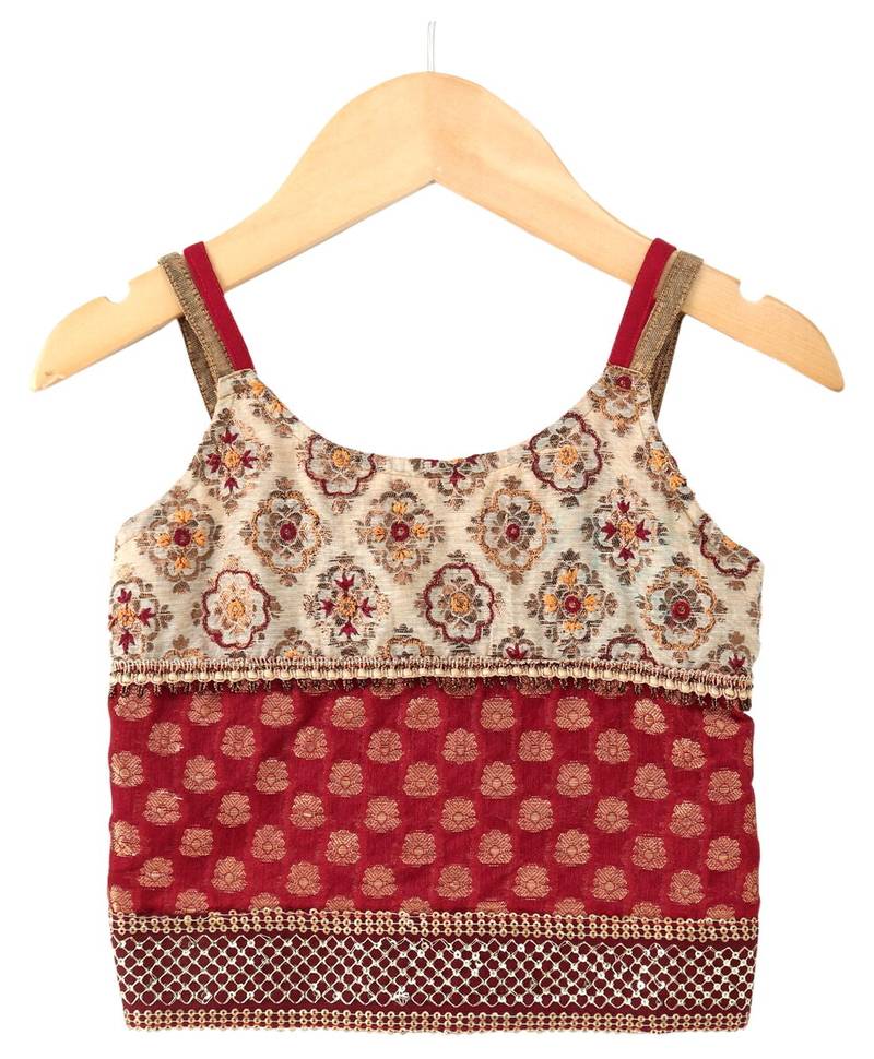 | Product Description | Twisha Woven Brocade Sleeveless Embellished Top With Printed Dhoti Red & Green |