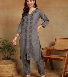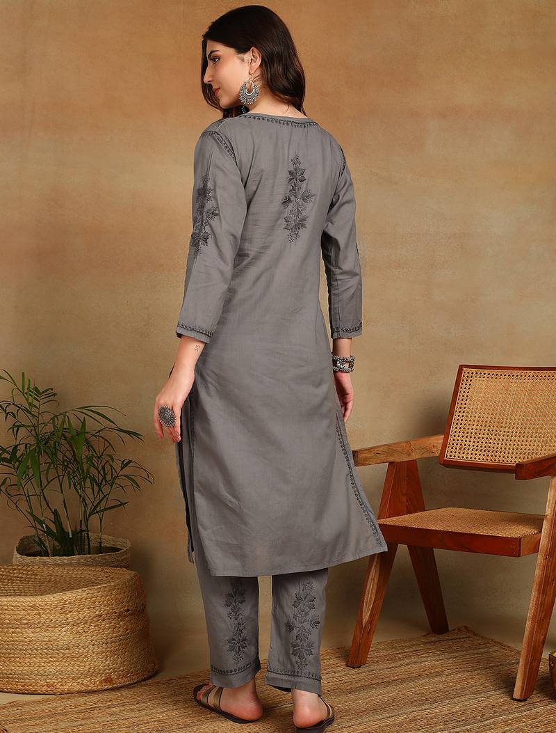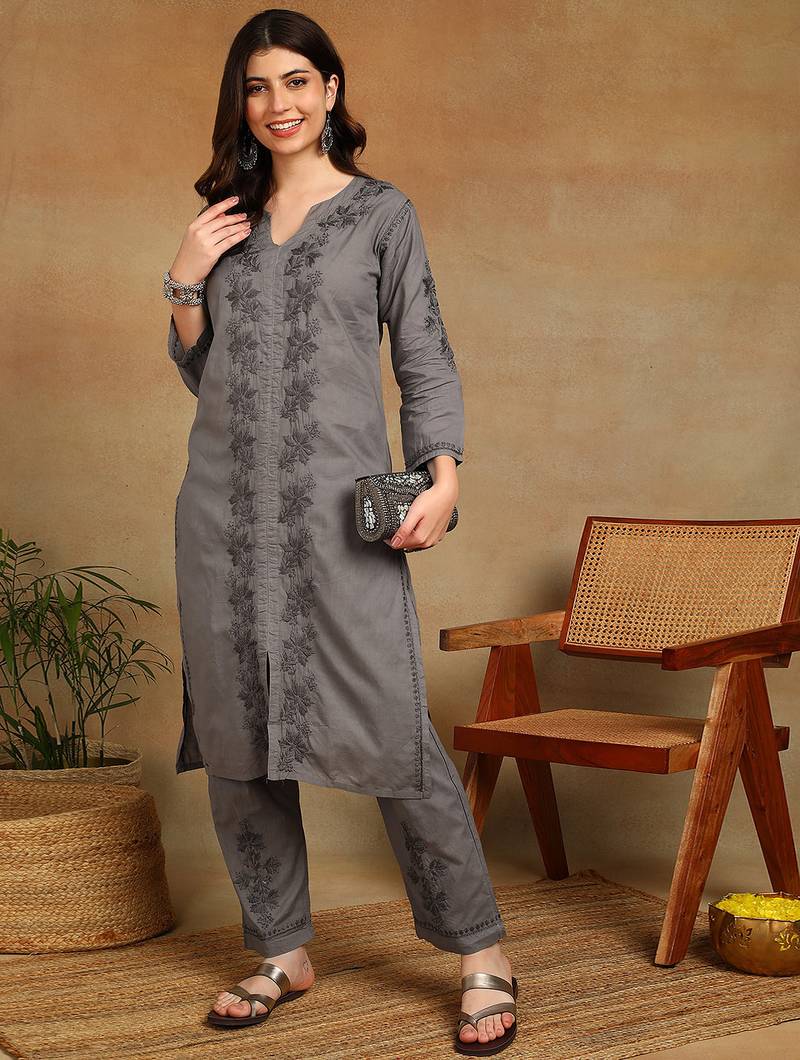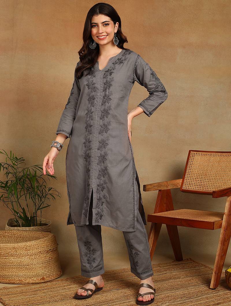 | Product Name | Women's Hand Embroidered Grey Floral Chikankari Front Slit Straight Pure Cotton Kurta With Palazzo | |