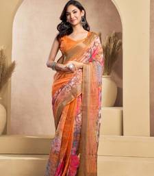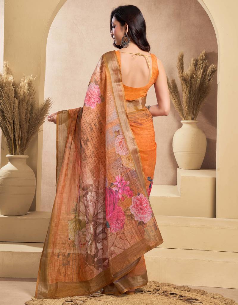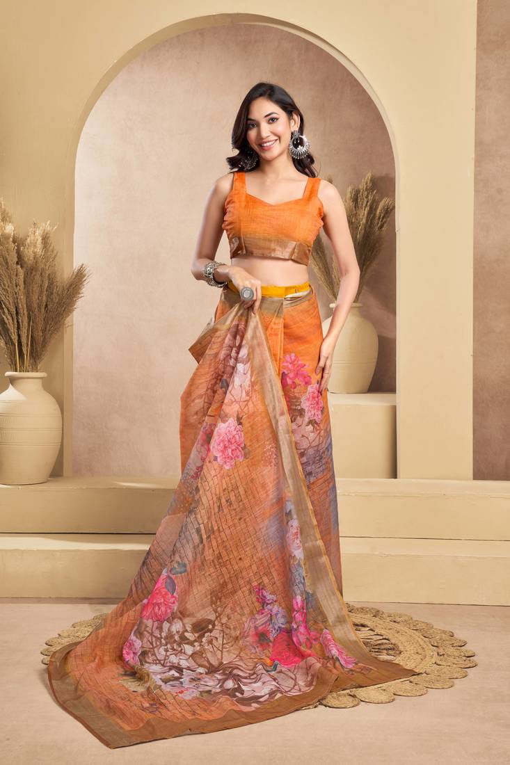 | Product Name | Orange Linen Printed Ready To Wear Saree With Zari Work Border | Easy Draping One Minute Saree | |