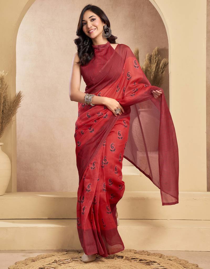 Red ready to wear printed linen saree with zari border – one minute saree – unstitched blouse