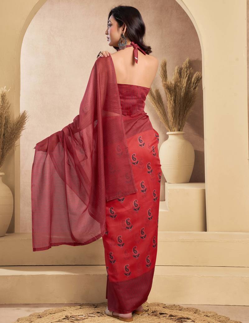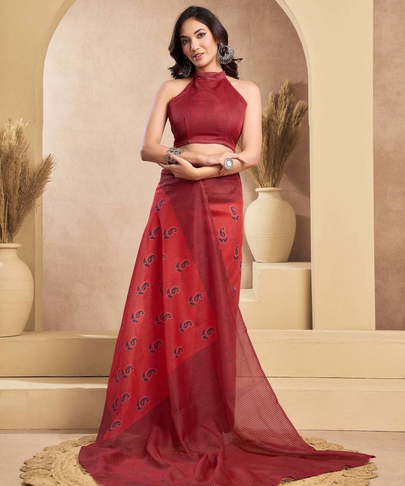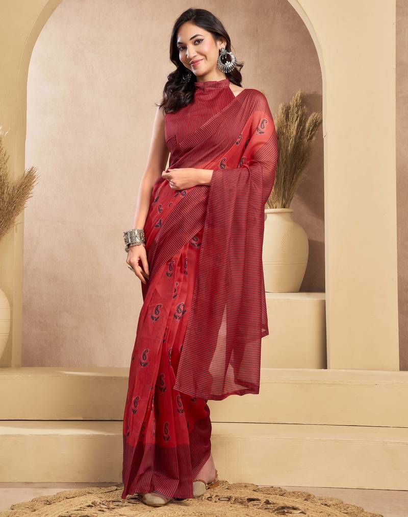 | Product Name | Red Ready To Wear Printed Linen Saree With Zari Border – One Minute Saree – Unstitched Blouse | |
