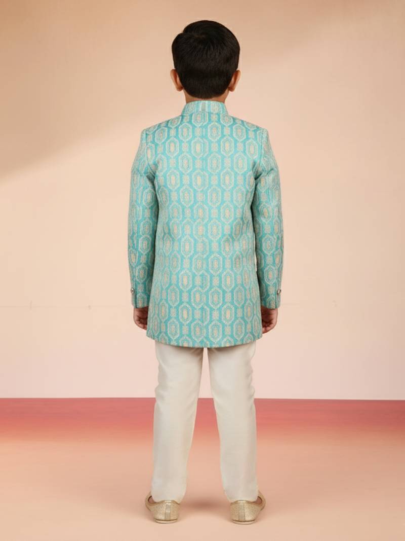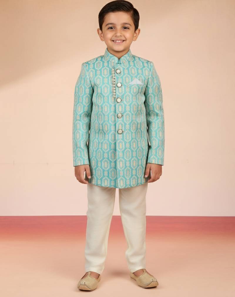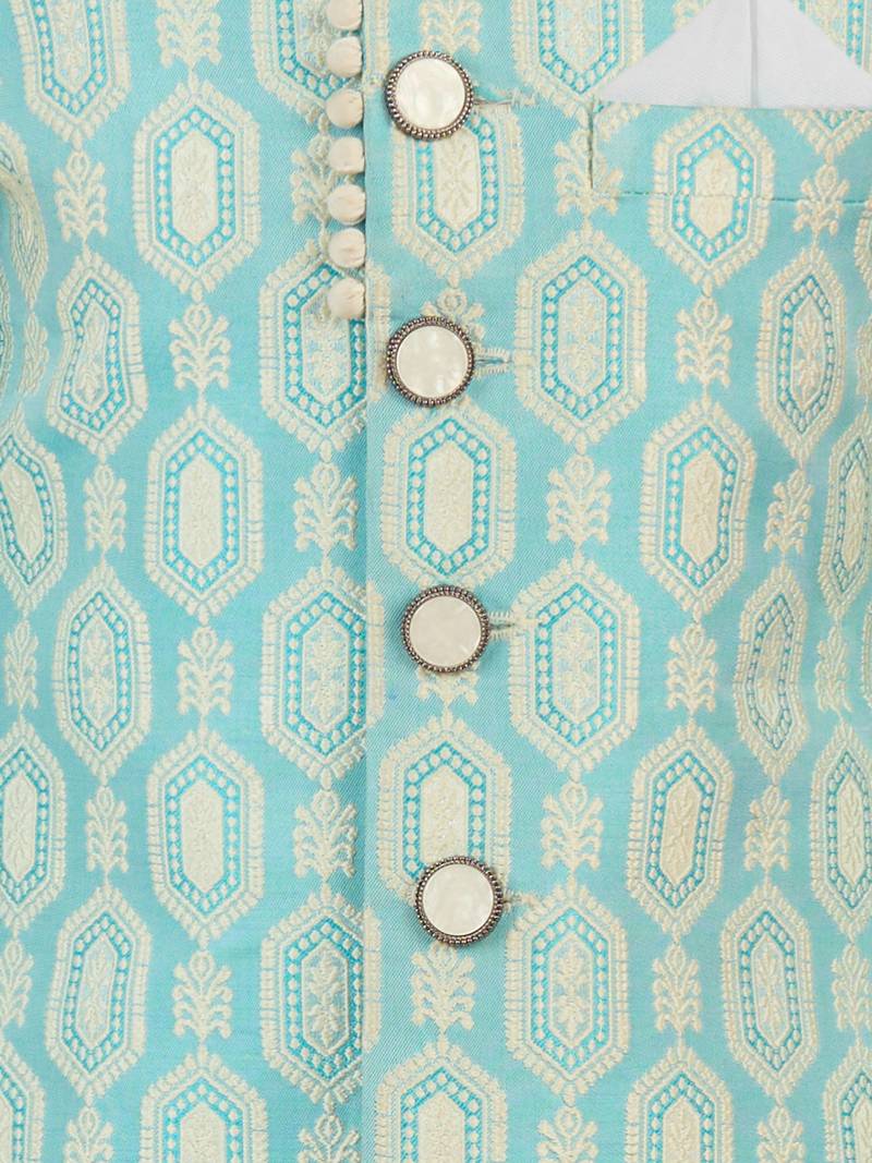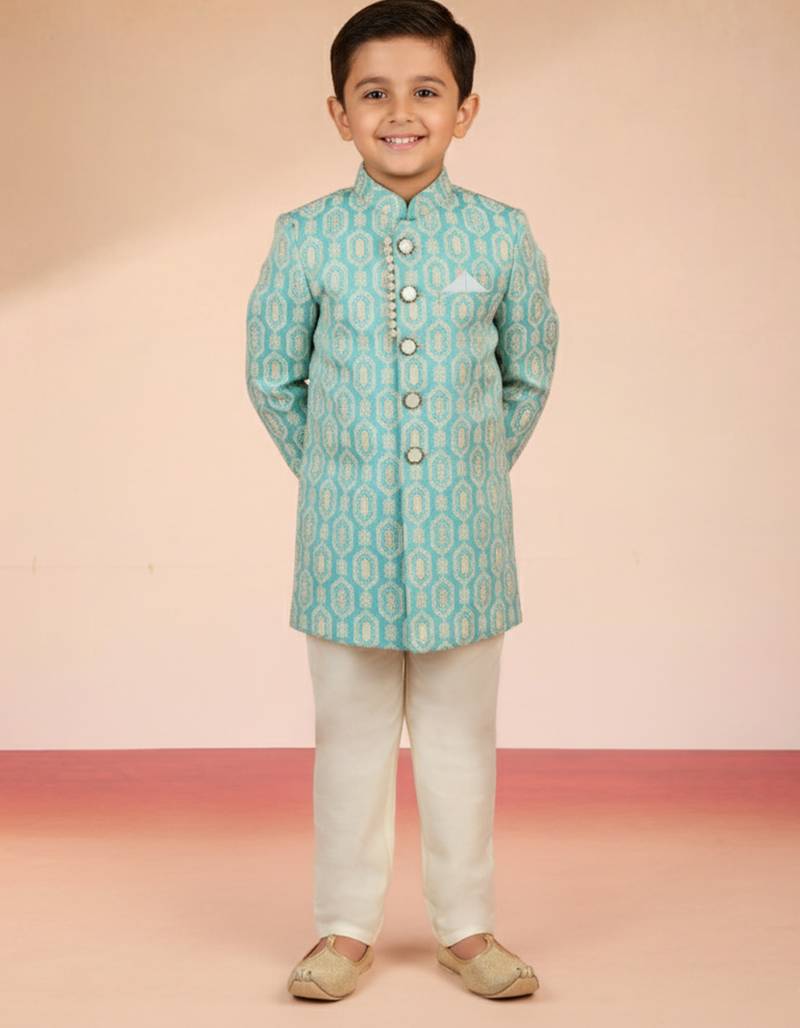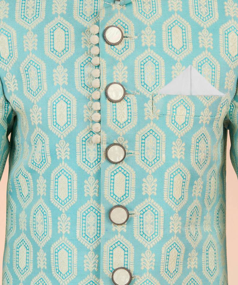 | Product Description | Make A Statement With Vastramay's Aqua Silk Blend Sherwani Set Featuring Elegant Jacquard Weave. Premium Silk Blend Fabric With Self Design Texture Creates Sophisticated Appeal. Complete With Cream Satin Pant For Contemporary Ethnic Styling. |