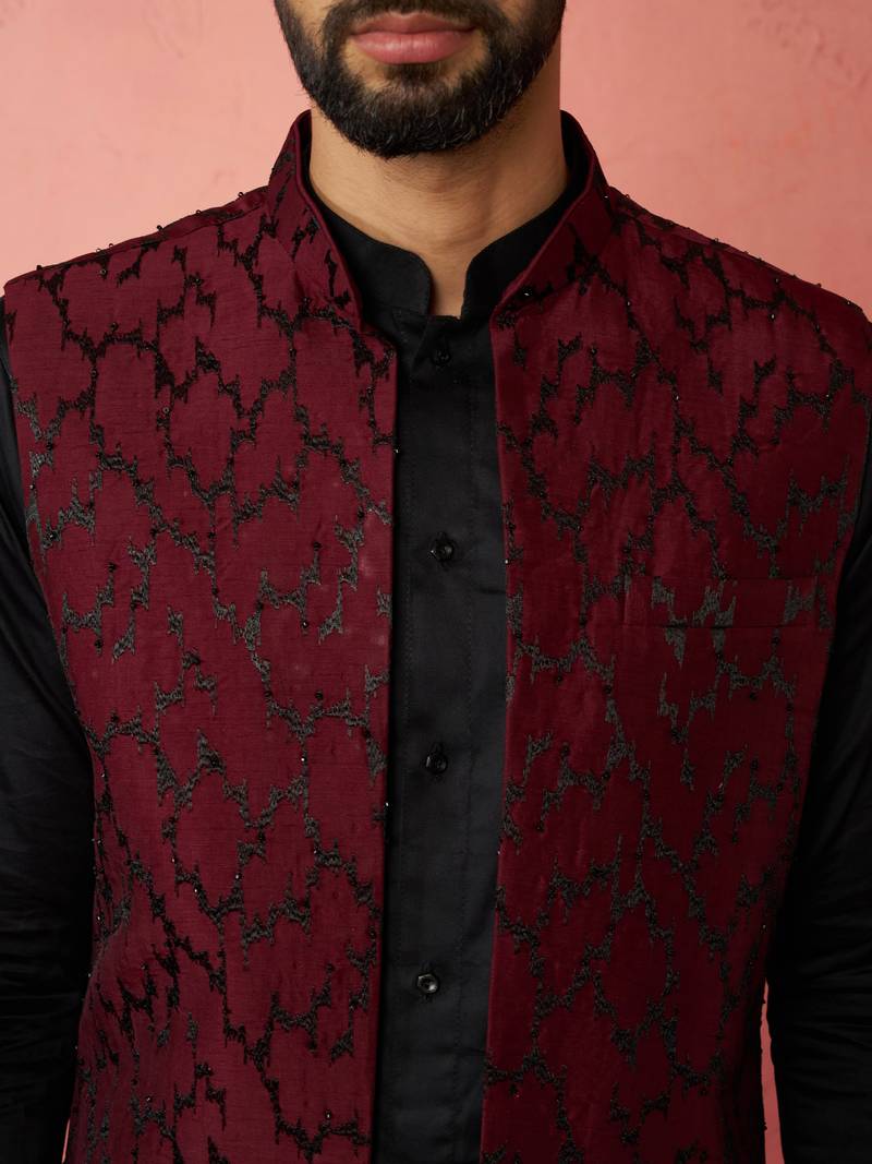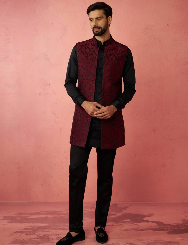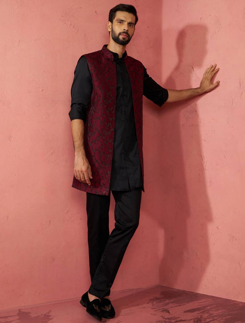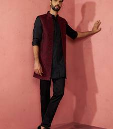 Product Description | Make A Statement With This Wine Colored Silk Kurta Set Featuring Elegant Nehru Jacket. Complete Ensemble With Black Trousers Perfect For Special Occasions And Festivals. |