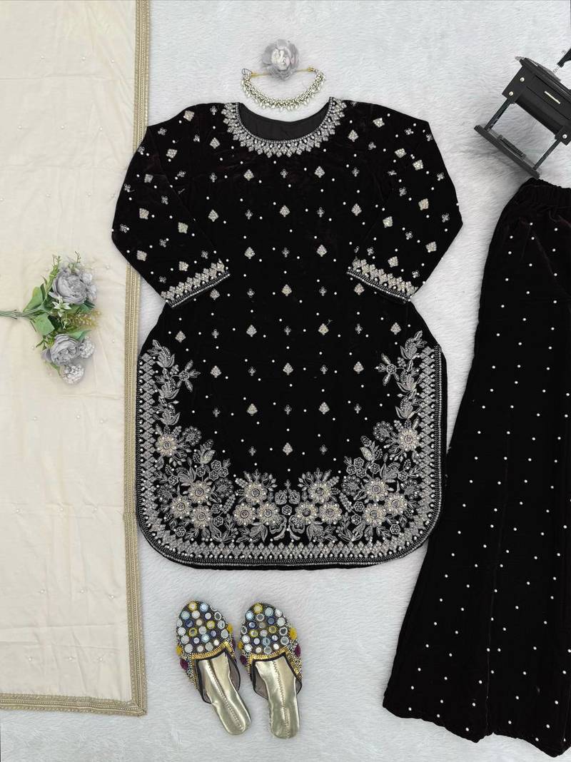 Black viscose velvet intricate thread & sequence with peral work top plazzo with dupatta stitched