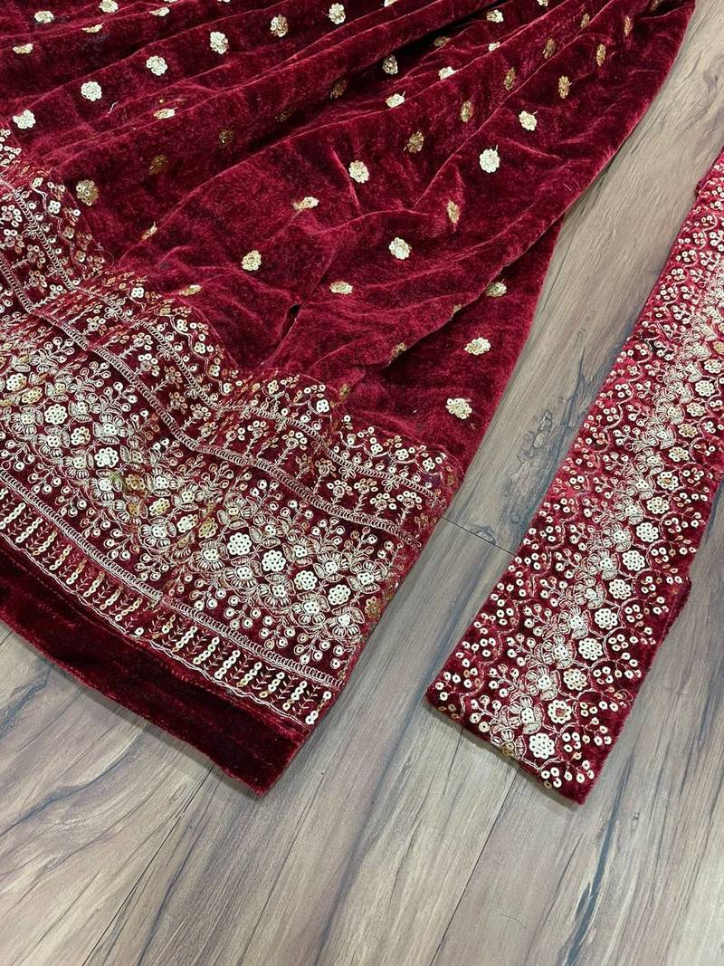 Wine viscose velvet sequence embroidery work gown dupatta with belt stitched