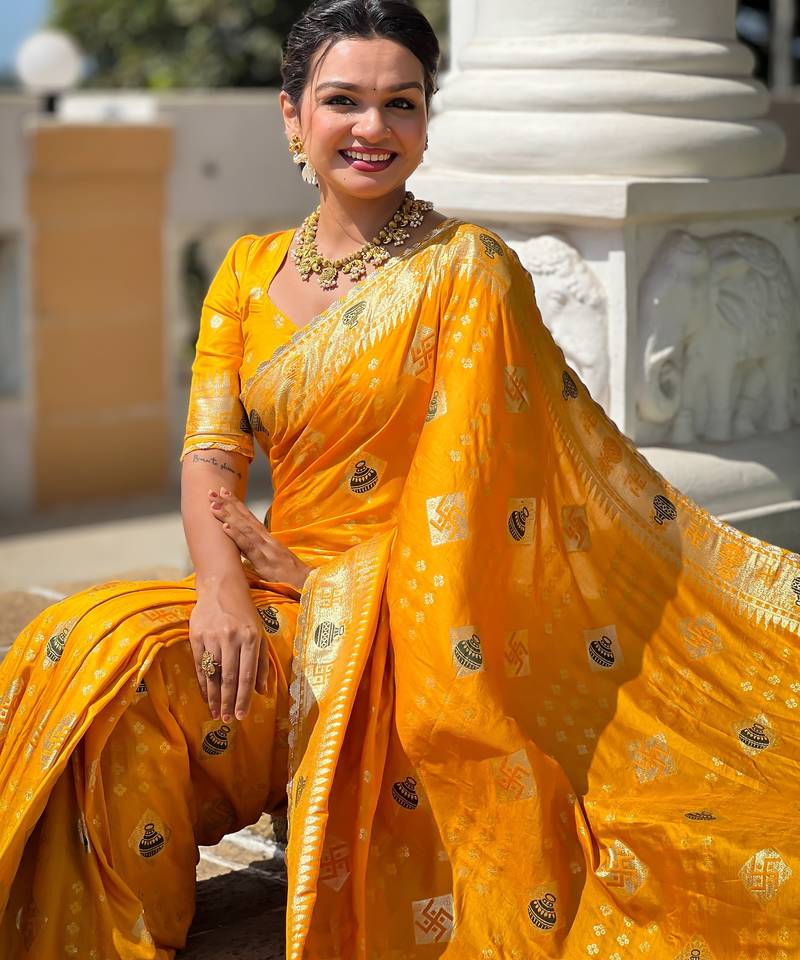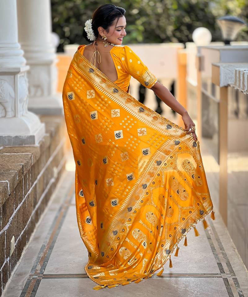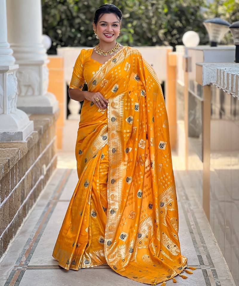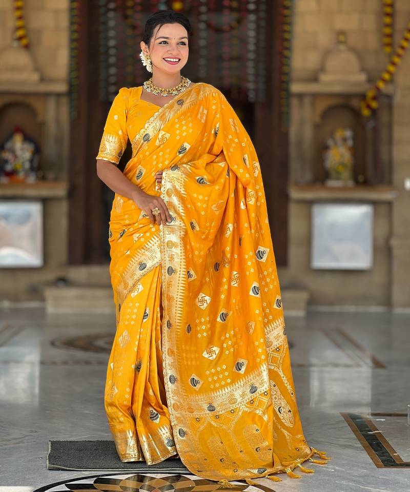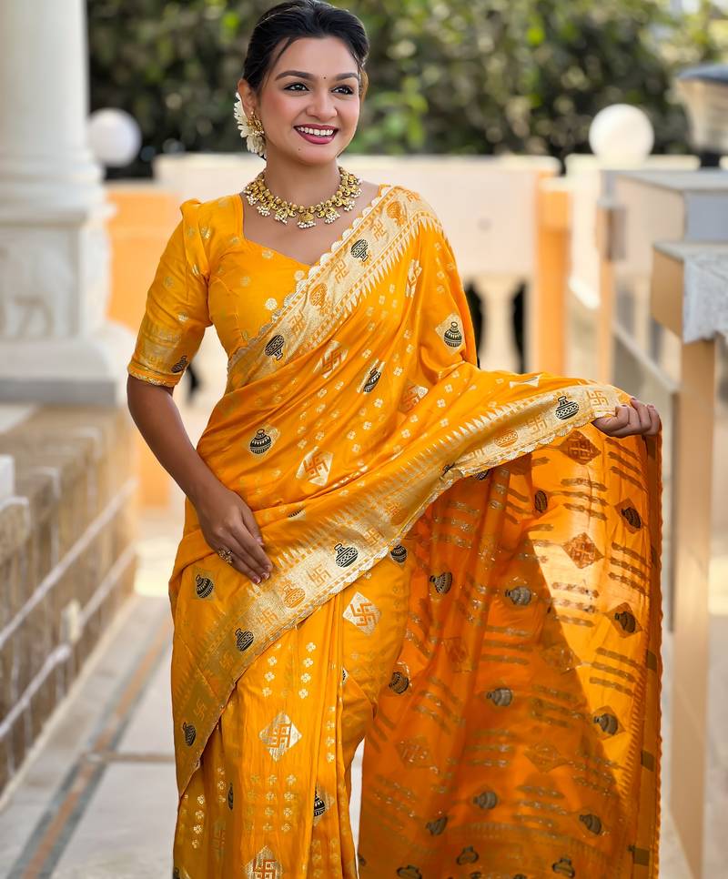 Soft dola art silk fancy jacquard bollywood saree (swastik-dola-yellow)