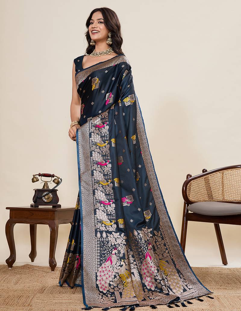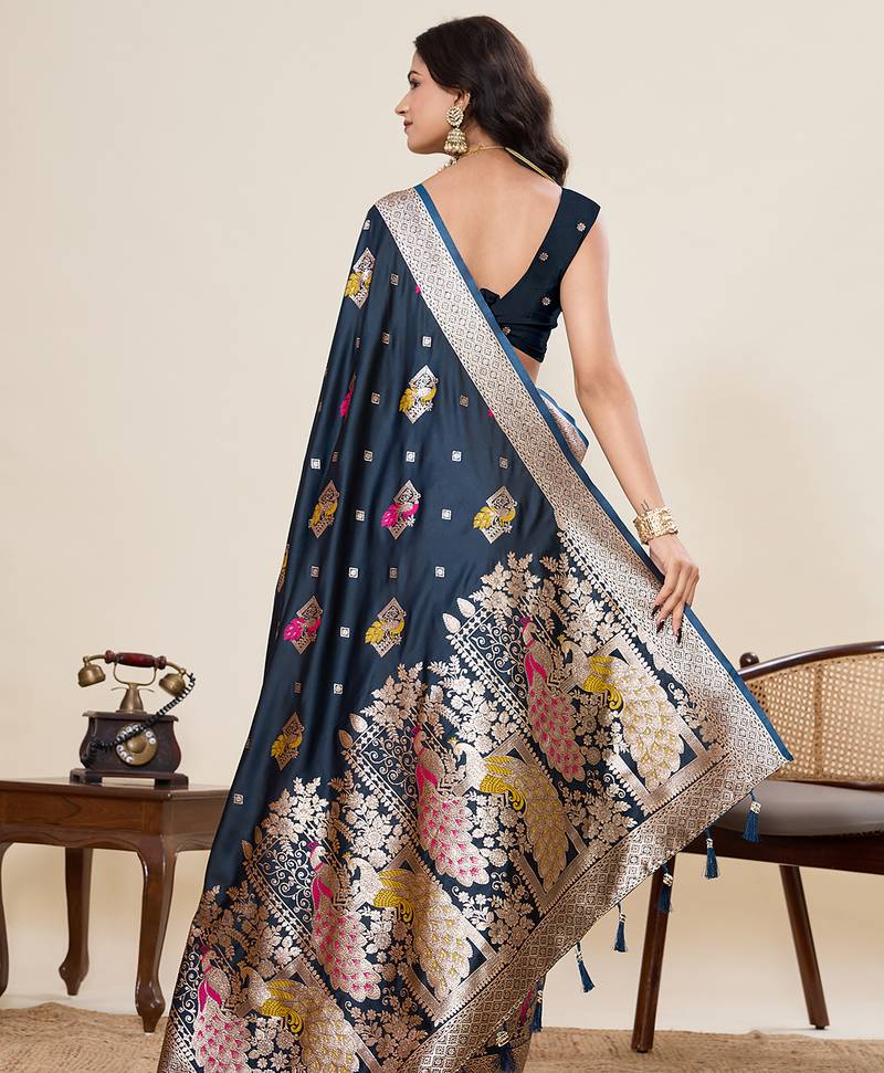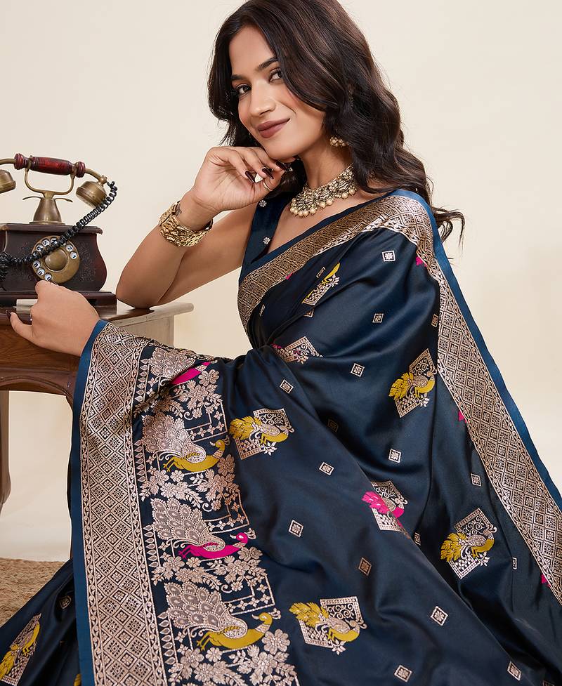Soft litchi art silk banarasi art silk jacquard saree (yesha-02-navy)