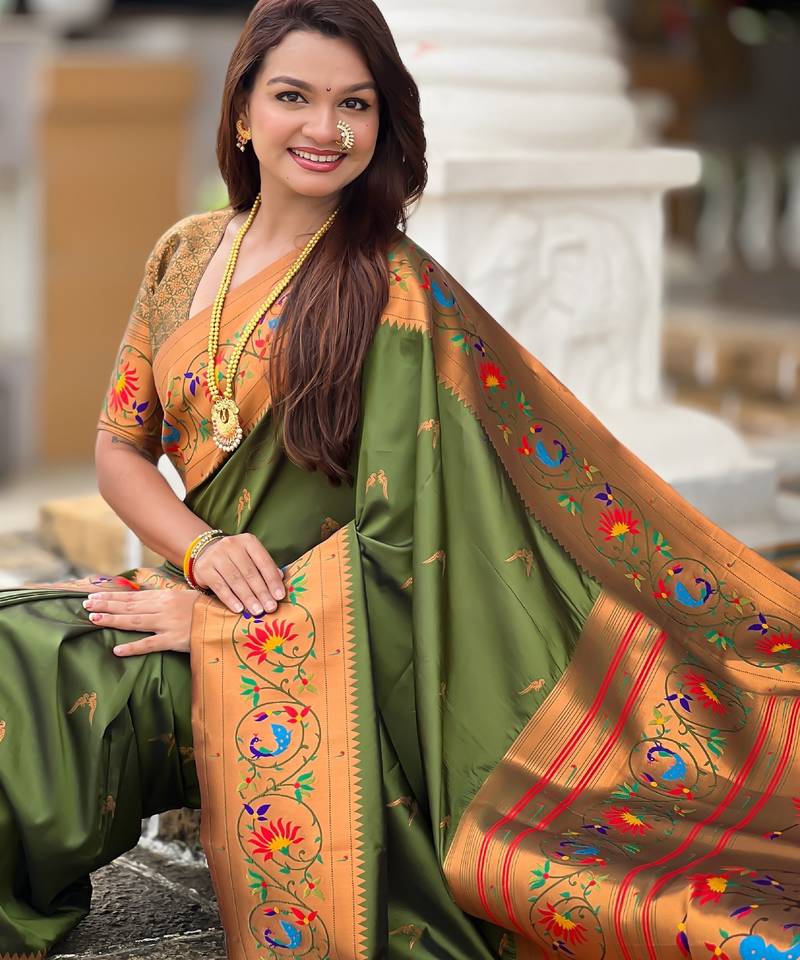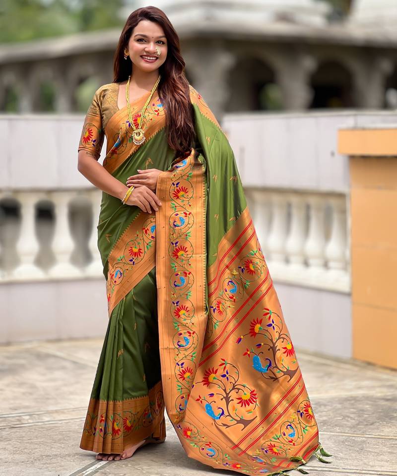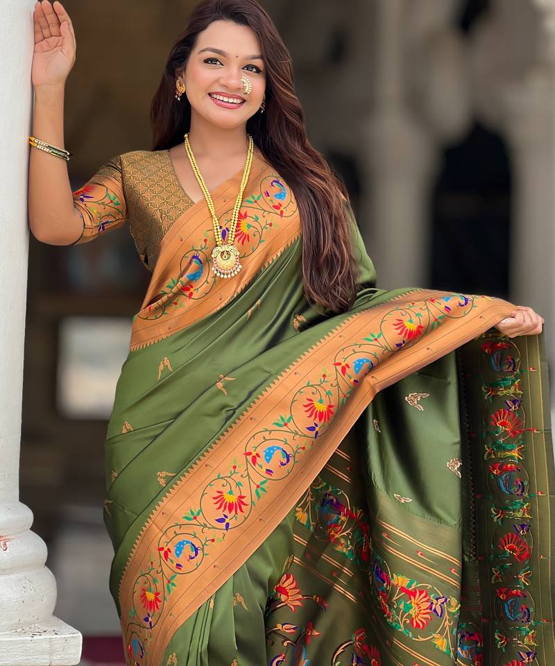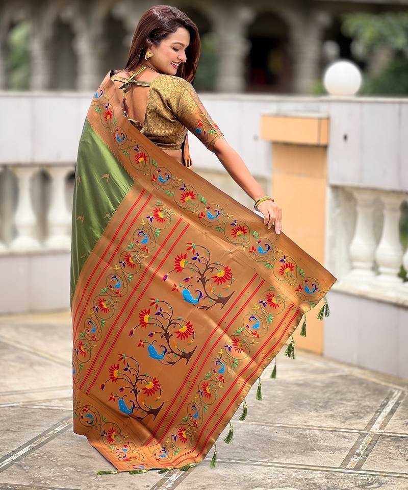 Soft litchi art silk paithani jacquard saree (harmony-paithani-2-mahendi)
