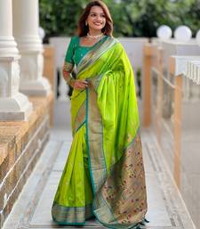 | Product Description | We Offers Paithani Softy Silk Saree With Rich Intricate Meenakari Golden Zari Jacquard Work At All Over Body, Border & Grand Pallu. Blouse, Border And Pallu Have Very Fine Contrast Color Matching With Saree Body. Saree & Blouse Material Is Litchi Silk Which Very Soft And Skin Friendly Material. Saree Has Beautiful Zalar (Tessel) Work At Pallu. This Saree Has A Length 6.30 Meter Which Includes 0.8 Meters Of The Blouse. These New Bollywood Designer Fashionable Saree For Women Can Be Used As Party Wear Saree, Festival Saree, Wedding Saree On Every Occasions. Product Colour May Slightly Very Due To Photographic Lighting Sources Or Your Monitor Settings. |