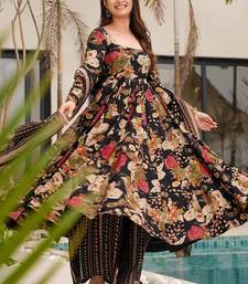 Black floral print cotton anarkali suit stitched