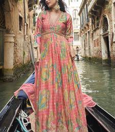 Peach chinon silk embroidered digital print festive look gown with dupatta stitched