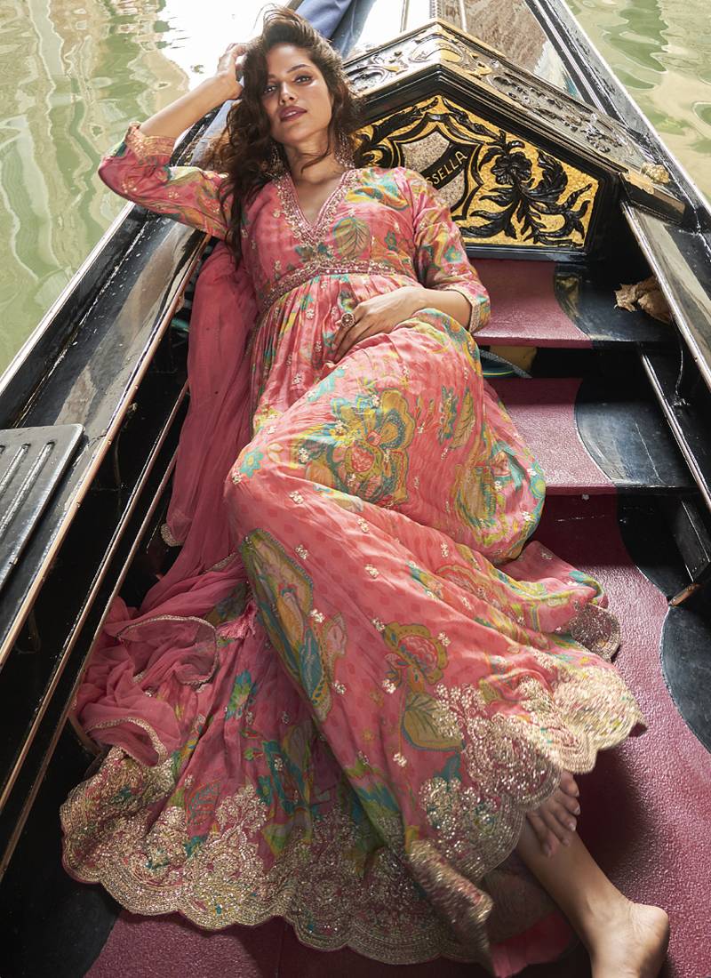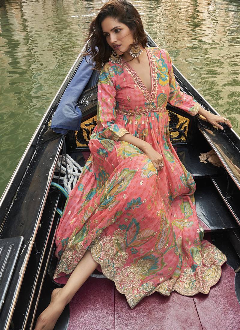 | Product Name | Peach Chinon Silk Embroidered Digital Print Festive Look Gown With Dupatta | |