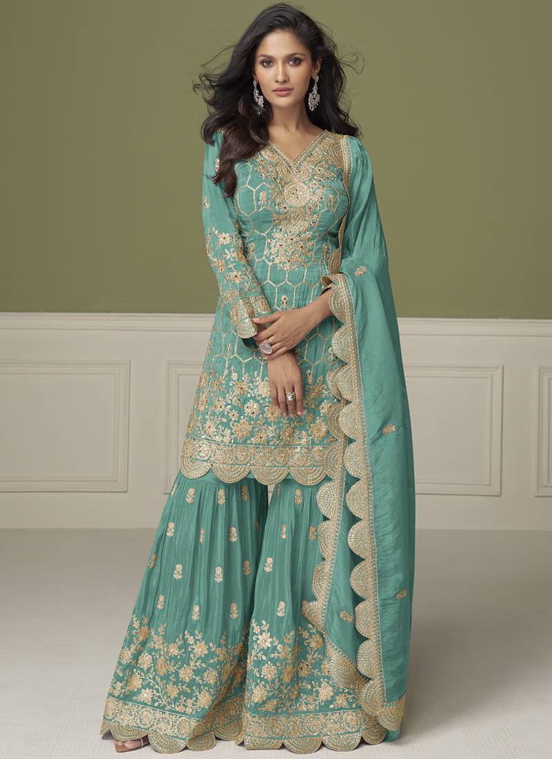 Sea green simar silk embroidered designer plazzo suit stitched