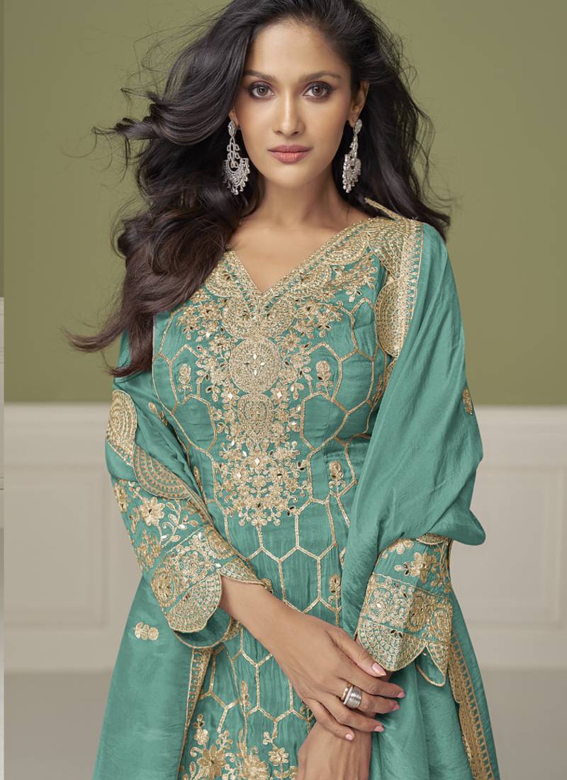 Product Name Sea Green Simar Silk Embroidered Designer Plazzo Suit
