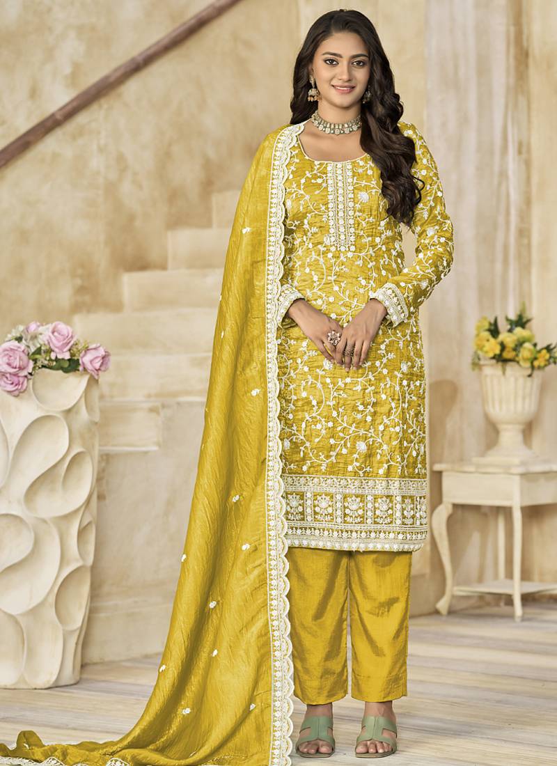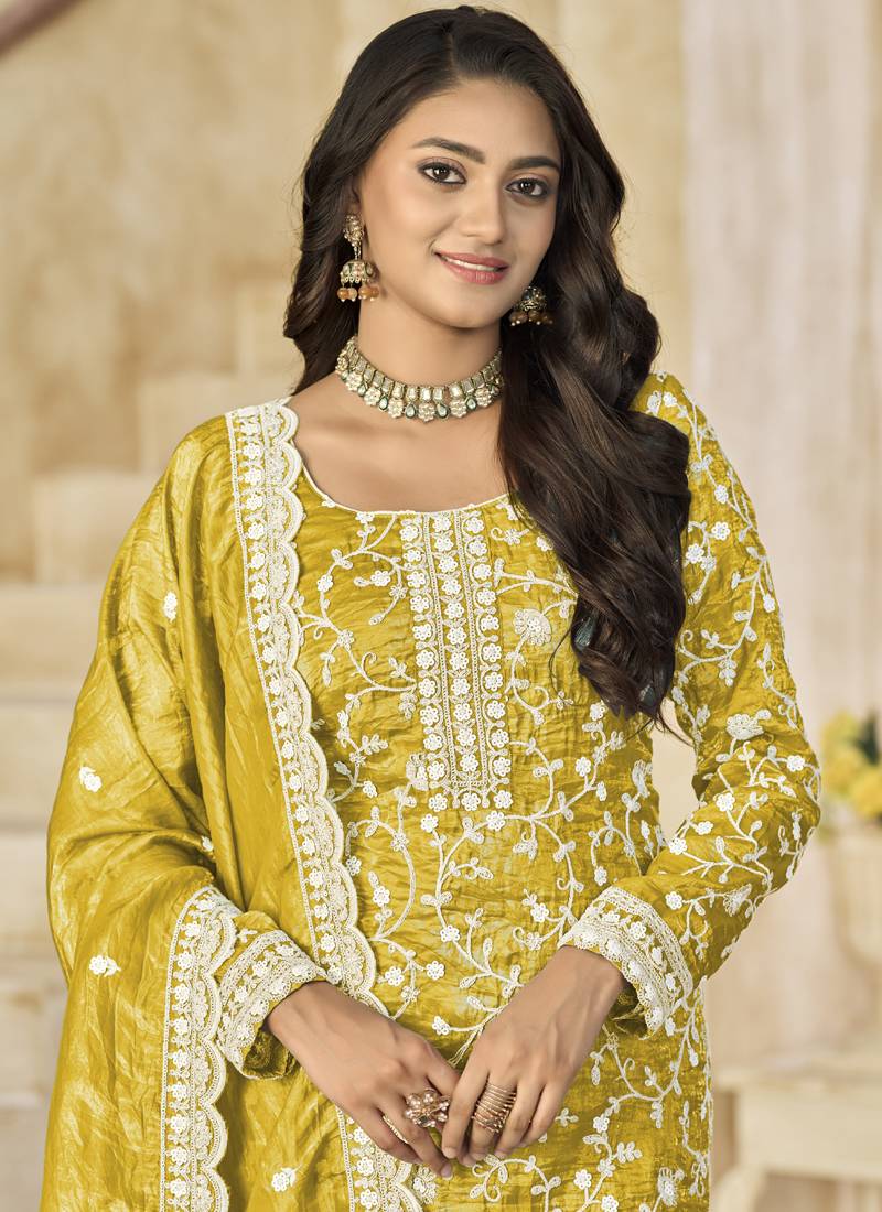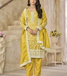 Yellow organza embroidered salwar suit for festival semi stitched
