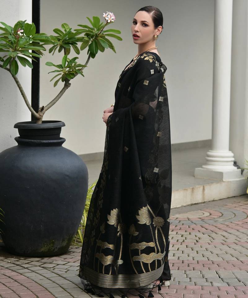 Premium Soft Jute Linen Silk Saree Will Rich Zari Weaved Pallu And Double Shaded Zari Weaves Border And All Over Weaves Buttis With Fancy Tassels And Running Blouse Piece