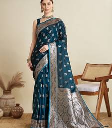 Blue satin printed saree with blouse