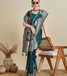 Blue satin printed saree with blouse