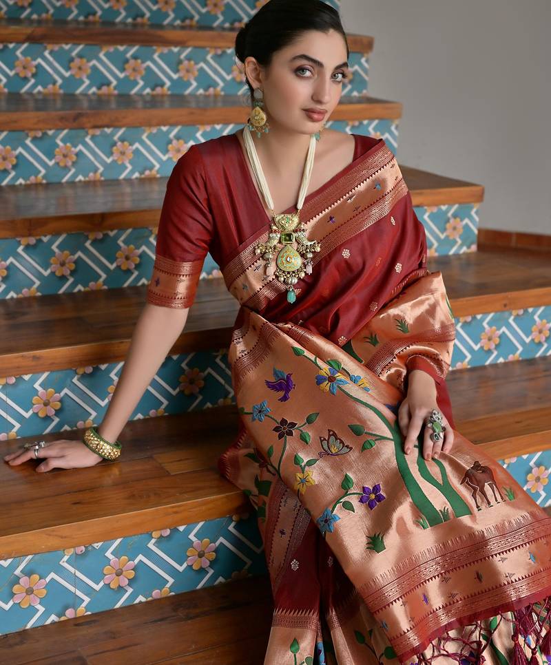 | Product Description | Soft Banarasi Silk Paithani Saree With Beautiful Zari Weaving Paithani Pallu And Tradional Meena Woven Big Border With Fancy Tassels And Running Blouse Piece |