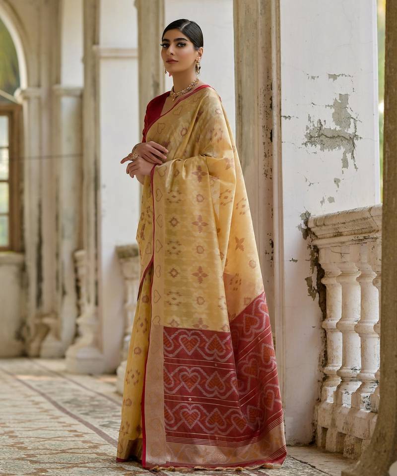 | Product Description | Soft Desi Raw Silk Saree With Beautiful Contrast Weaved Ikkat Pallu And Zari Woven Border With Fancy Tassels And Contrast Blouse Piece |