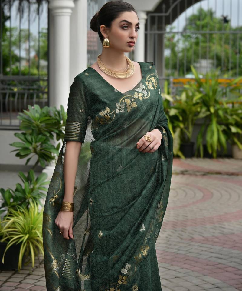 Green solid linen saree with blouse