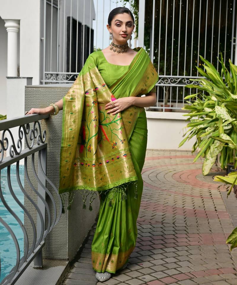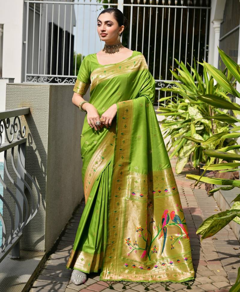 | Product Description | Soft Banarasi Silk Paithani Saree With Rich Zari And Meena Woven Shiny Pallu With All Over Tiny Zari Woven Butties And Zari Weaves Border With Fancy Tassels And Running Blouse Piece |