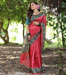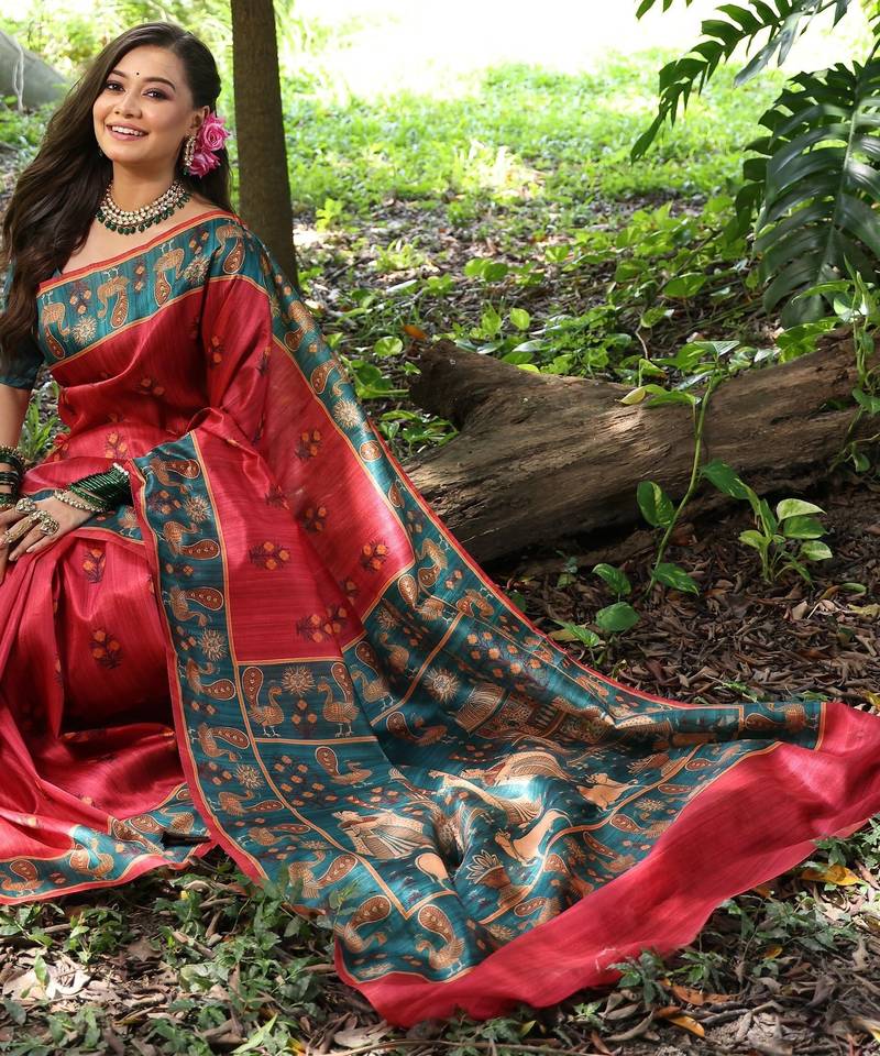 Red solid tussar silk saree with blouse