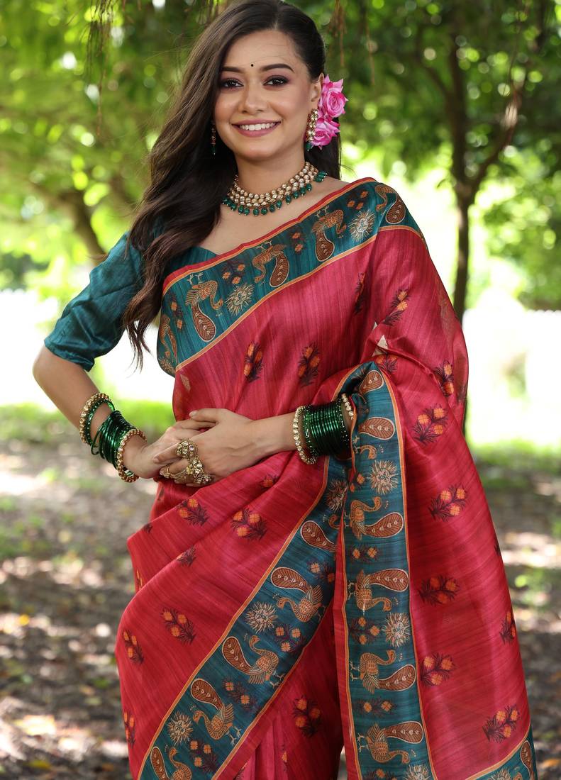 | Product Description | Soft Tussar Silk Saree With Beautiful Peacock Prints With Traditional Printed Pallu And Contrast Border With Contrast Blouse Piece |