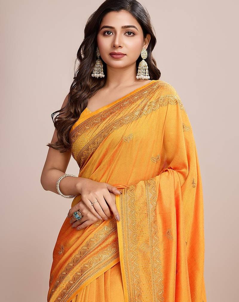 | • | Saree | : | Color- Yellow / Fabric- Silk Blend |
