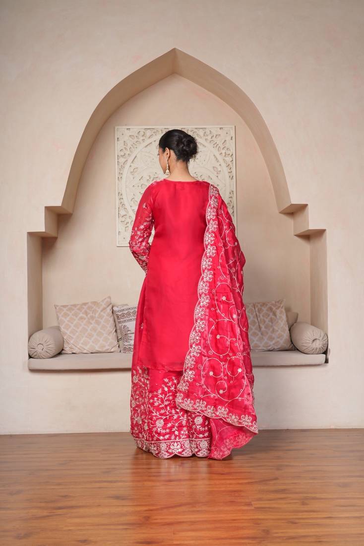 | Product Description | A Sophisticated Three Piece Outfit Featuring A Long Line Kurti And Wide Leg Palazzos, Tied Together By Elaborate Silver Thread Floral Vines And Modern Scalloped Edges. |