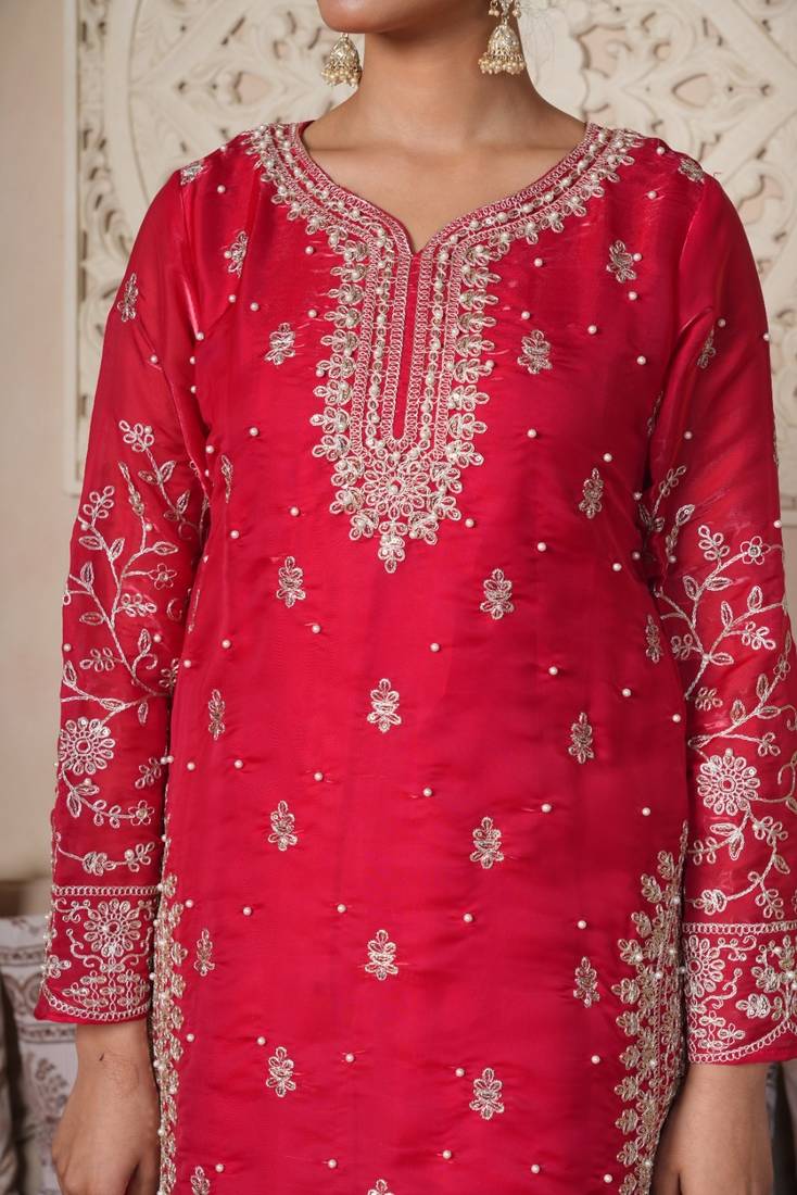 | • | Kameez | : | Color- Pink / Fabric- Raw Silk |