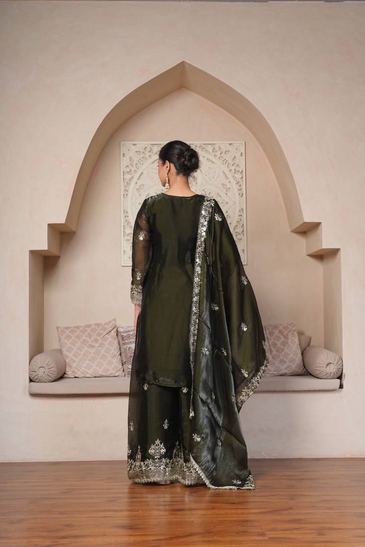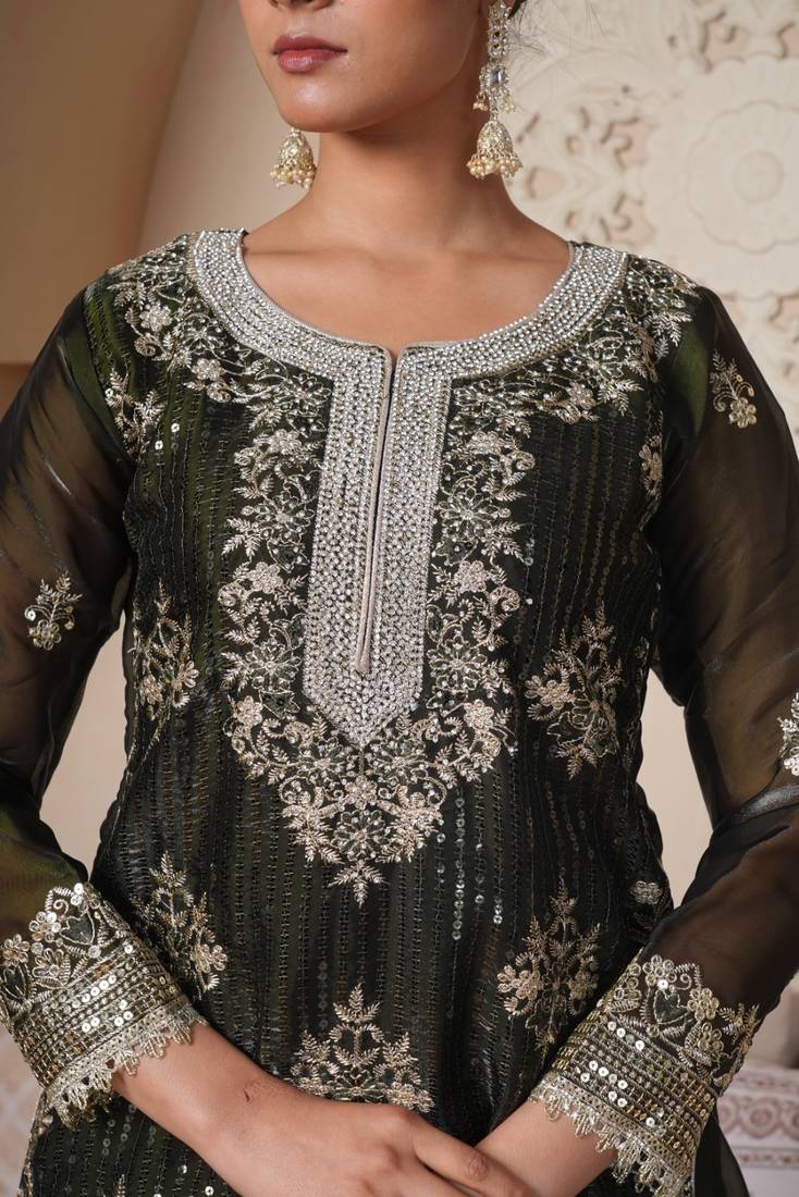 | Product Description | A Glamorous Three Piece Set Featuring A Straight Cut Kurti And A Voluminous Sharara, Characterized By Vertical Lines Of Shimmering Sequins And Intricate Silver Floral Embroidery. |