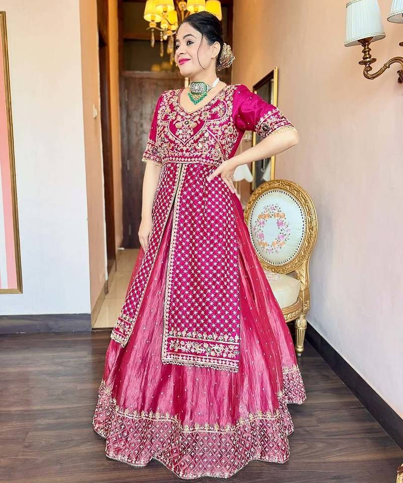 Product Name Pink Chinon Silk Party Wear Embroidery Crop Top With Blouse Lehenga Choli