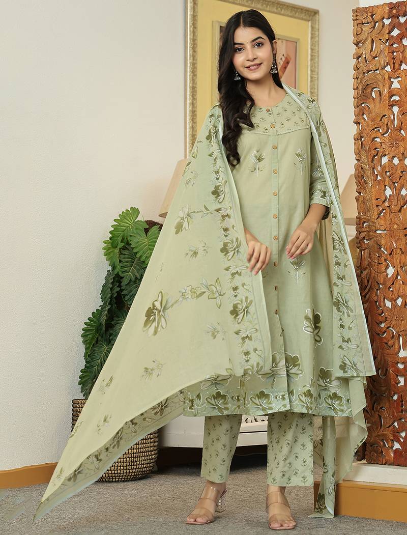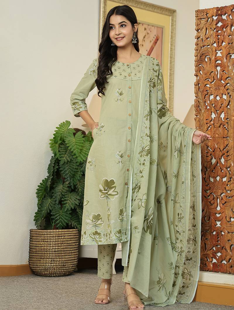 Product Description | Green Pure Cotton Floral Print A Line Kurta Trouser Dupatta Set One Pocket Kurta Design Kantha Work,Sequins Work A Line Shape Front Slits Three Quarter Sleeve Sleeves Round Neck Calf Length Kurta Straight Him Machine Weave Pure Cotton Trouser Design: Green Pure Cotton Trouser Slip On Waist Size & Fit Material & Care Pure Cotton |